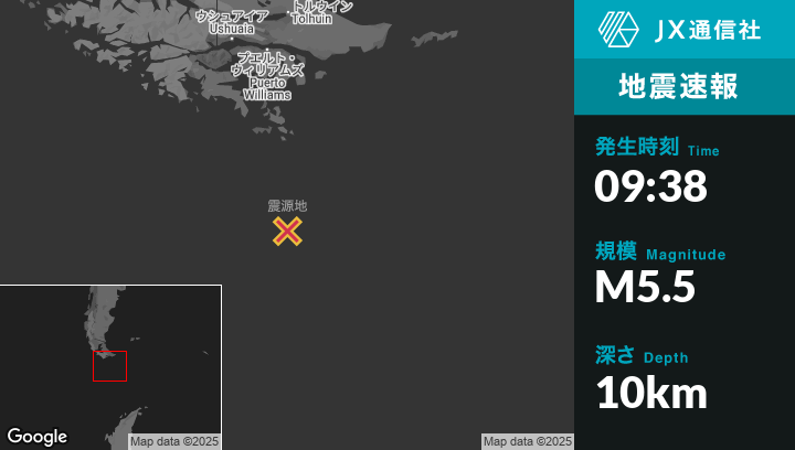 5月21日 09:38頃、アルゼンチンのUshuaiaから南南東242kmの地点でM5.5の地震がありました。