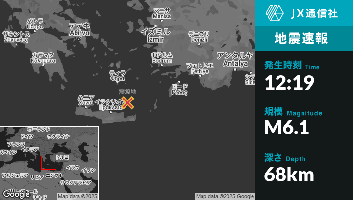 5月22日 12:19頃、ギリシャのEloúndaから北北東58kmの地点でM6.1の地震がありました。