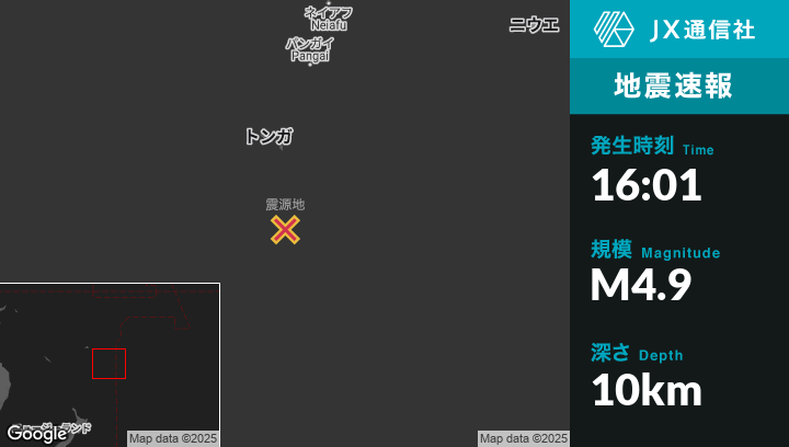 | 震源地 | トンガの‘Ohonuaから南159kmの地点 |