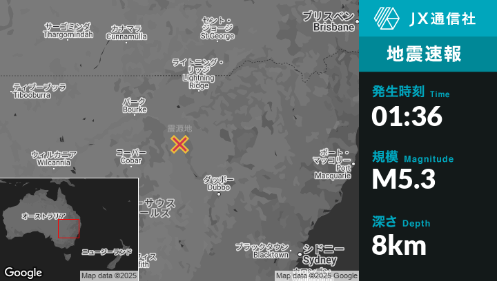| 震源地 | オーストラリアのNynganから北87kmの地点 |