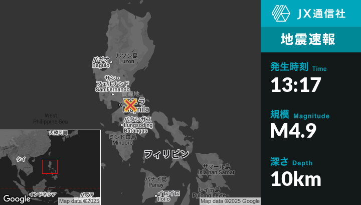 5月27日 13:17頃、フィリピンのDaraitanから北12kmの地点でM4.9の地震がありました。