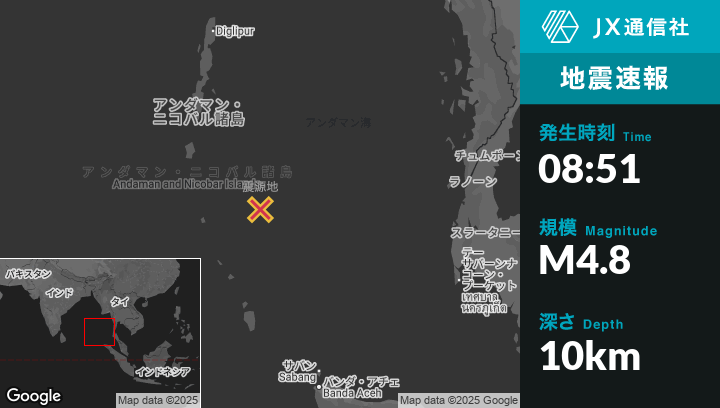 6月25日 08:51頃、インドのPort Blairから南南東274kmの地点でM4.8の地震がありました。