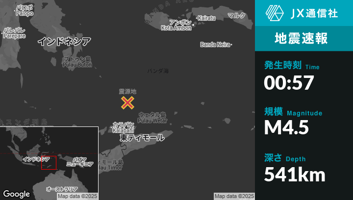 6月27日 00:57頃、東ティモールのLikisáから北176kmの地点でM4.5の地震がありました。