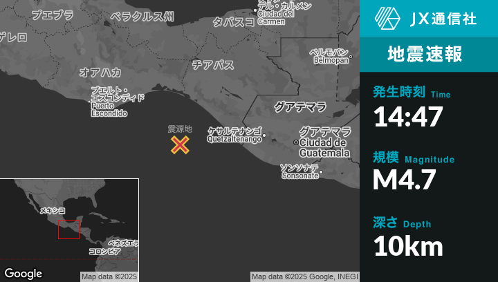6月28日 14:47頃、メキシコのEl Palmarcitoから南西140kmの地点でM4.7の地震がありました。
