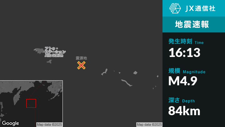 6月29日 16:13頃、アラスカのAttu Stationから東南東187kmの地点でM4.9の地震がありました。