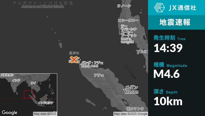 | 震源地 | インドネシアのSabangから西北西56kmの地点 |