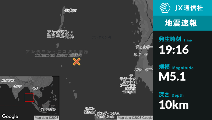 7月07日 19:16頃、インドのPort Blairから南南東259kmの地点でM5.1の地震がありました。