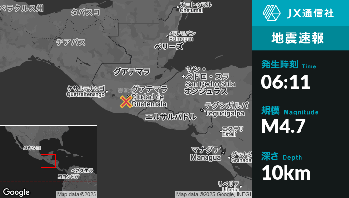 7月09日 06:11頃、グアテマラのAmatitlánから北3kmの地点でM4.7の地震がありました。