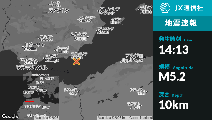 7月14日 14:13頃、スペインのSan Joséから南東21kmの地点でM5.2の地震がありました。