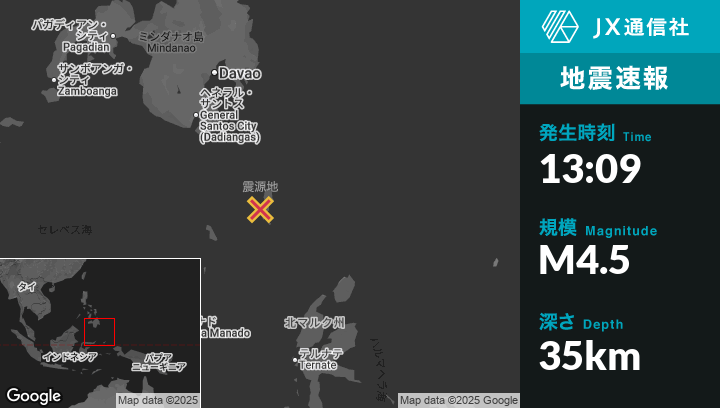 7月15日 13:09頃、フィリピンのSaranganiから南東185kmの地点でM4.5の地震がありました。