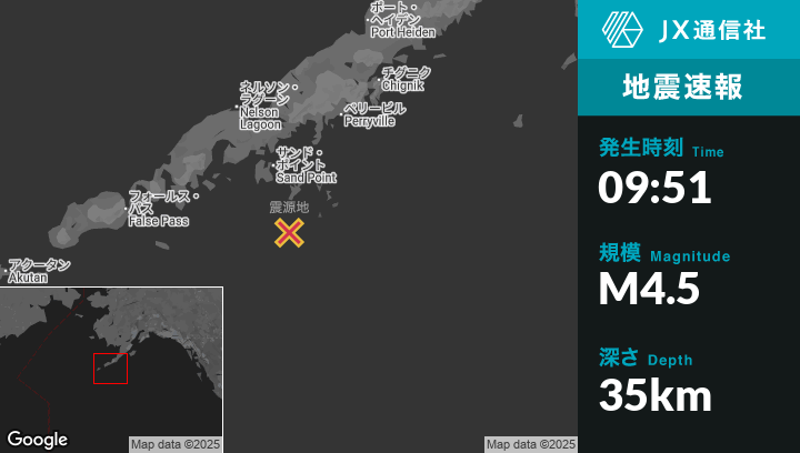 | 震源地 | アラスカのSand Pointから南南東79kmの地点 |
