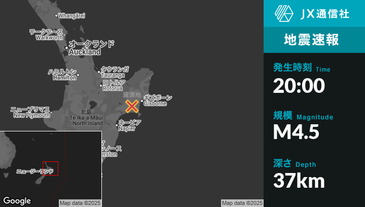 7月18日 20:00頃、ニュージーランドのTinirotoから北東1kmの地点でM4.5の地震がありました。
