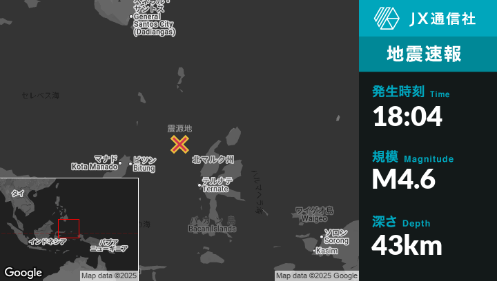 | 震源地 | インドネシアのTobeloから西北西150kmの地点 |