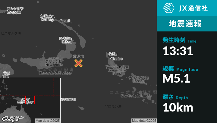 | 震源地 | パプアニューギニアのKokopoから南南東158kmの地点 |