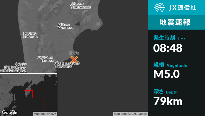 | 震源地 | ロシアのPetropavlovsk-Kamchatskyから東北東88kmの地点 |