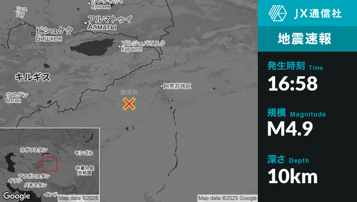 9月02日 16:58頃、中国のTumxukから北北西90kmの地点でM4.9の地震がありました。