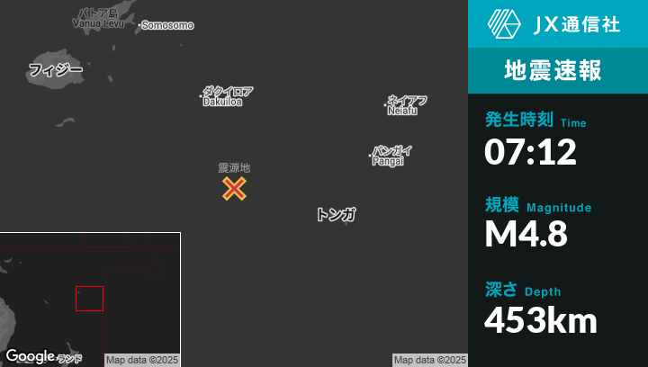 9月03日 07:12頃、トンガのHoumaから西北西260kmの地点でM4.8の地震がありました。