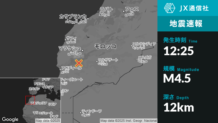 9月03日 12:25頃、モロッコのOukaïmedeneから南西47kmの地点でM4.5の地震がありました。