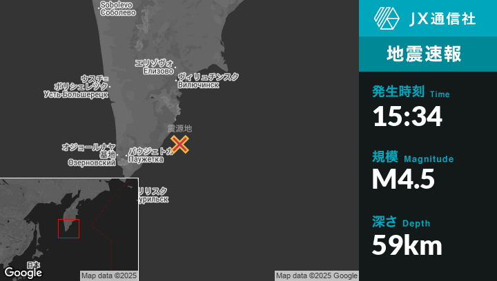9月04日 15:34頃、ロシアのVilyuchinskから南130kmの地点でM4.5の地震がありました。