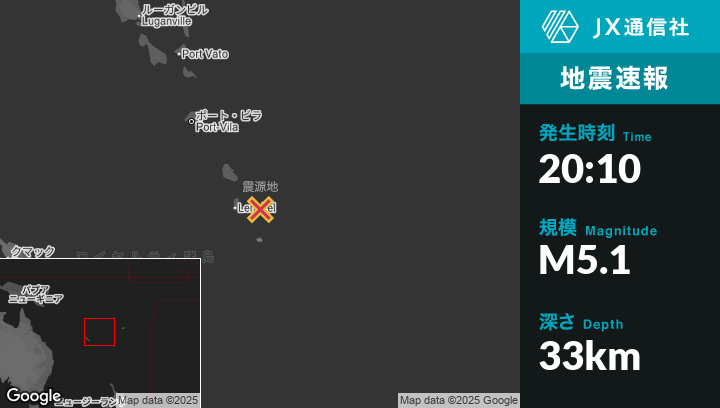 | 震源地 | バヌアツのIsangelから東57kmの地点 |