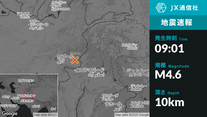 9月07日 09:01頃、アフガニスタンのJalālābādから北東25kmの地点でM4.6の地震がありました。