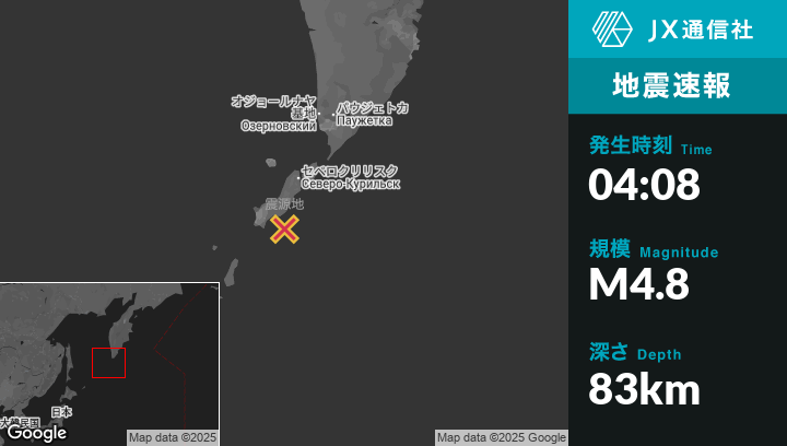 9月08日 04:08頃、ロシアのSevero-Kuril’skから南南西68kmの地点でM4.8の地震がありました。