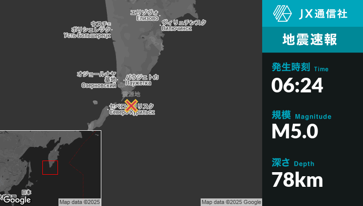 | 震源地 | ロシアのSevero-Kuril’skから東北東72kmの地点 |