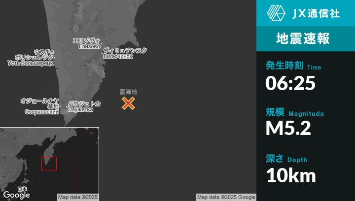 9月10日 06:25頃、ロシアのVilyuchinskから南南東163kmの地点でM5.2の地震がありました。