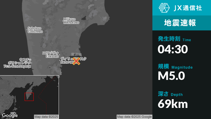 | 震源地 | ロシアのPetropavlovsk-Kamchatskyから東67kmの地点 |