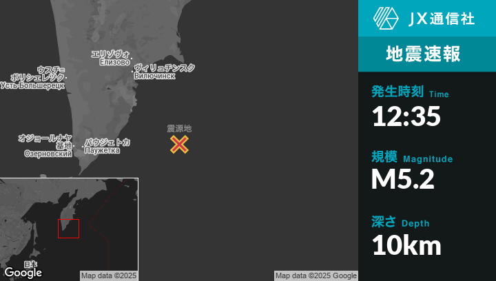 9月11日 12:35頃、ロシアのVilyuchinskから南南東180kmの地点でM5.2の地震がありました。
