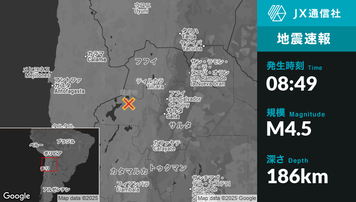 | 震源地 | アルゼンチンのSan Antonio de los Cobresから西71kmの地点 |