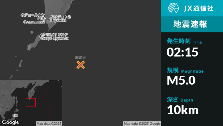 9月16日 02:15頃、ロシアのSevero-Kuril’skから南東247kmの地点でM5.0の地震がありました。