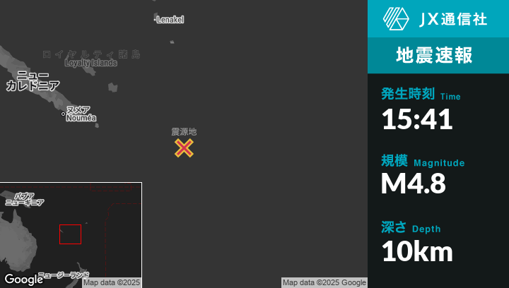 | 震源地 | ニューカレドニアのVaoから東280kmの地点 |