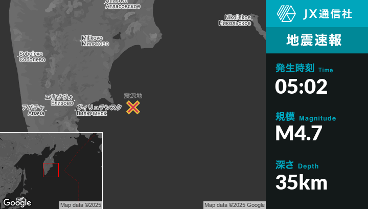 | 震源地 | ロシアのPetropavlovsk-Kamchatskyから東150kmの地点 |