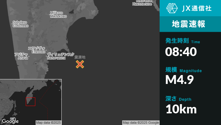 | 震源地 | ロシアのPetropavlovsk-Kamchatskyから東南東153kmの地点 |