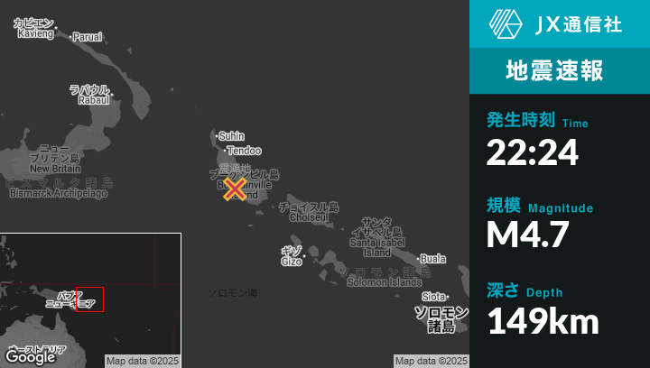 9月19日 22:24頃、パプアニューギニアのPangunaから西37kmの地点でM4.7の地震がありました。
