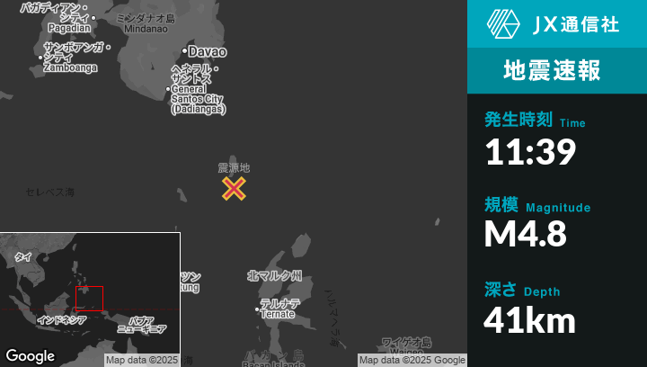 9月20日 11:39頃、フィリピンのSaranganiから南東227kmの地点でM4.8の地震がありました。