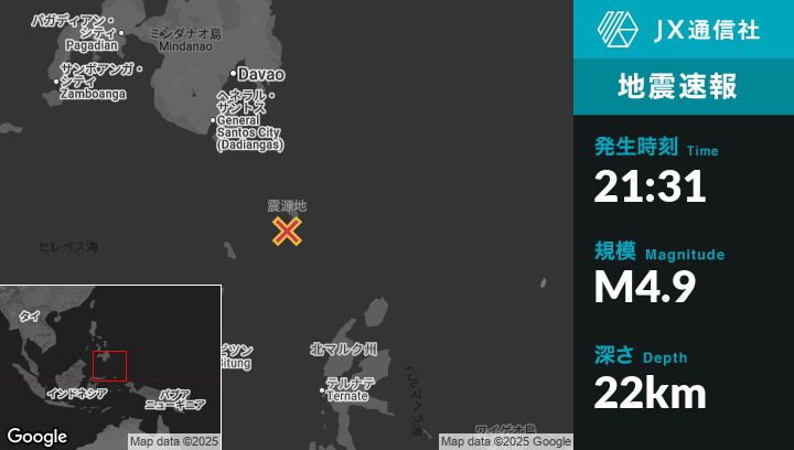 11月27日 21:31頃、フィリピンのSaranganiから南東199kmの地点でM4.9の地震がありました。