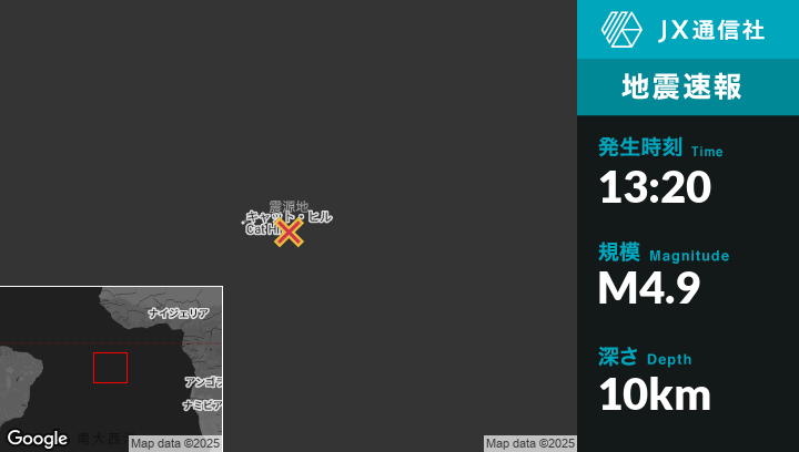 11月29日 13:20頃、セントヘレナのGeorgetownから東99kmの地点でM4.9の地震がありました。