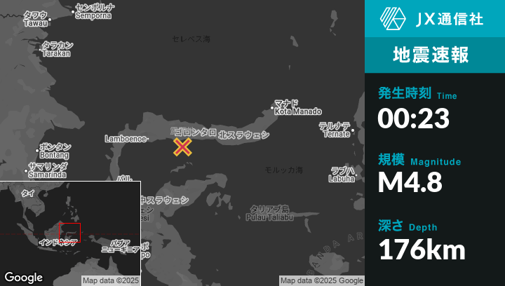 11月30日 00:23頃、インドネシアのGorontaloから西116kmの地点でM4.8の地震がありました。