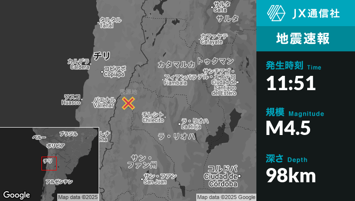 | 震源地 | アルゼンチンのVinchinaから西北西96kmの地点 |
