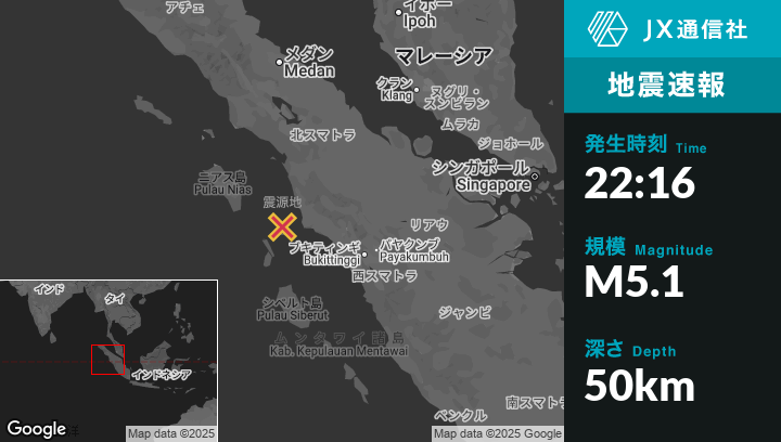 12月02日 22:16頃、インドネシアのTeluk Dalamから東南東103kmの地点でM5.1の地震がありました。