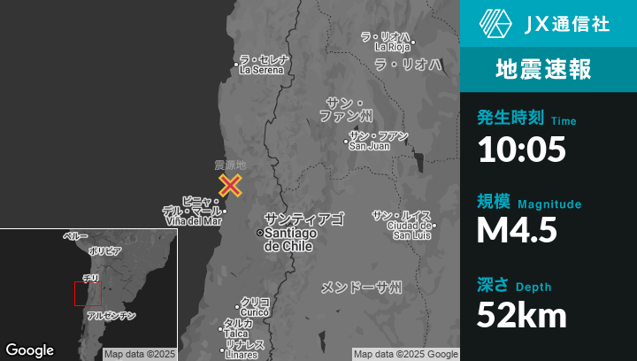 12月24日 10:05頃、チリのLa Liguaから西北西20kmの地点でM4.5の地震がありました。