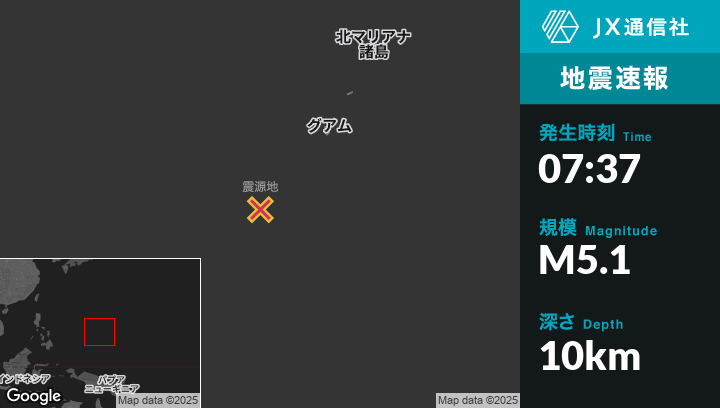 12月25日 07:37頃、グアムのMerizo Villageから南西226kmの地点でM5.1の地震がありました。