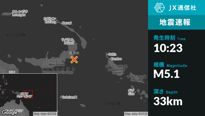 | 震源地 | パプアニューギニアのKokopoから南126kmの地点 |