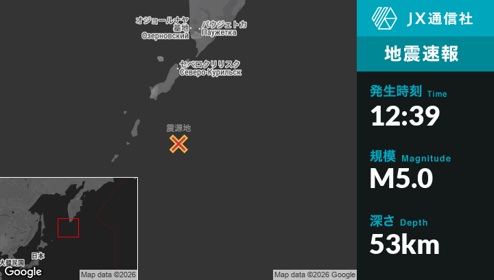 1月10日 12:39頃、ロシアのSevero-Kuril’skから南165kmの地点でM5.0の地震がありました。