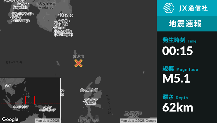 1月11日 00:15頃、インドネシアのTobeloから北北西242kmの地点でM5.1の地震がありました。