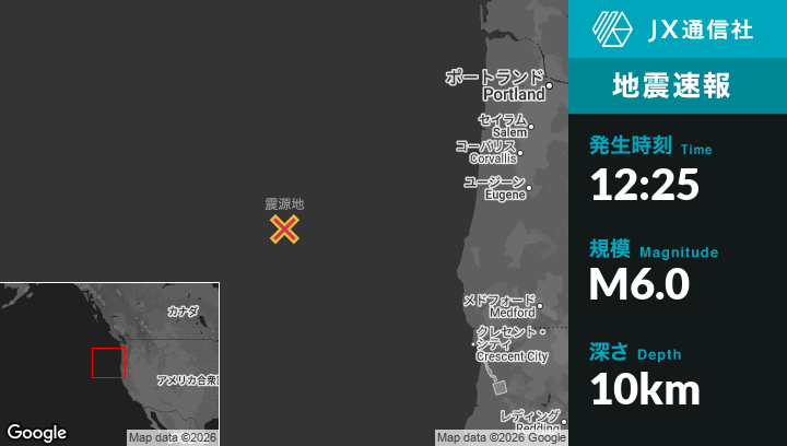 | 震源地 | オレゴンのBandonから西295kmの地点 |