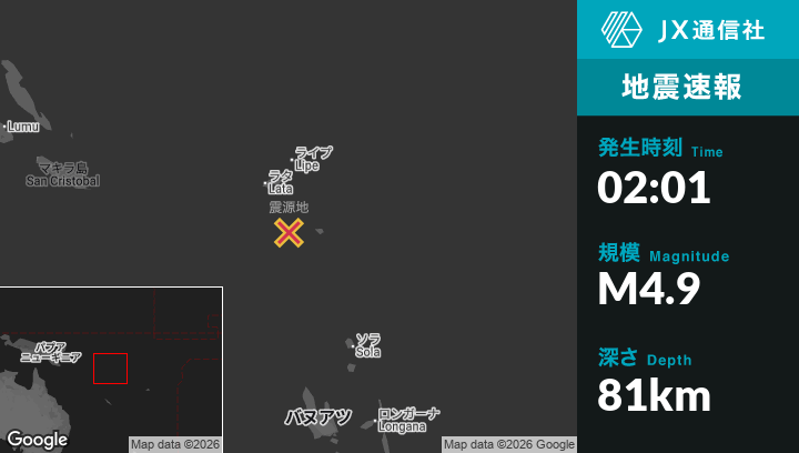 | 震源地 | ソロモン諸島のLataから南南東107kmの地点 |
