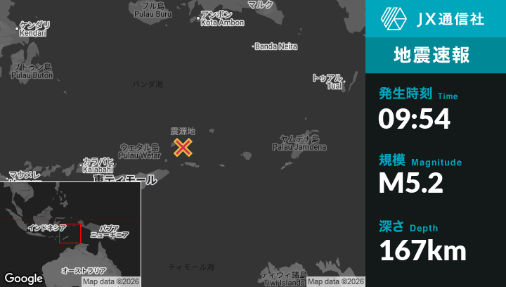 1月26日 09:54頃、東ティモールのLospalosから北東134kmの地点でM5.2の地震がありました。